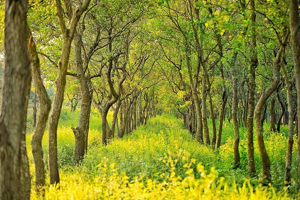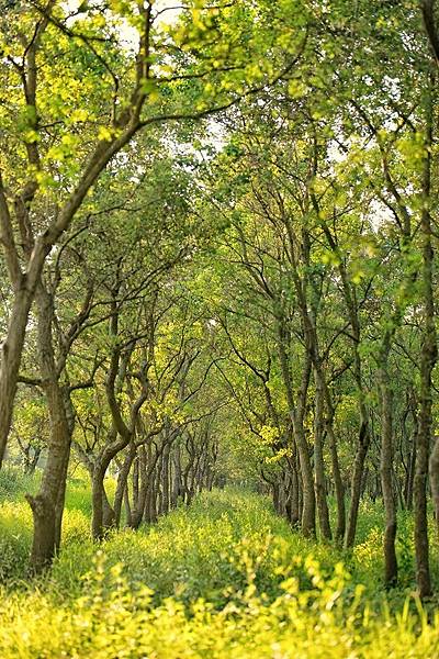 樹木整齊地排列著,枝幹自然彎曲交錯,遠遠看起來像是隧道的入口,不只台中,嘉義也有一道迷人的「龍貓隧道」。而此時綠意森林正由翠綠轉為金黃,黃綠穿插的漸層色調,彷彿宮崎駿電影中的配色,相當夢幻。