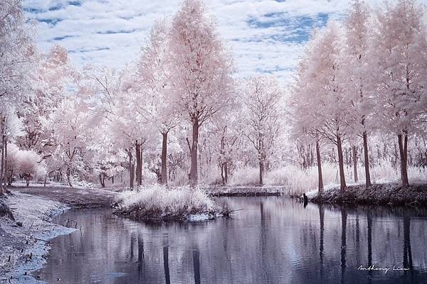 另一處則是能捕捉到「忘憂森林」般的景致,落羽松林倒映於湖泊中,染上了一層綠意,搭著藍天白雲,畫面十分愜意。相信等道冬季之時,落羽松轉紅一定會更為驚艷!同時也有攝影師大方分享攝影技巧,透過「紅外線攝影」讓陽光下的植物變成夢幻雪白景,冰川雪地的浪漫畫面讓不少網友看了驚呼:感覺身處日本冬日雪季!